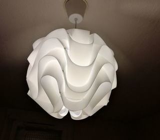 Un grand lustre style lampion, 1 joli lustre blanc, sous forme de structure circulaire en plastique, 1 adorable petit lustre en plastique à monter, les parties sont en forme de pet