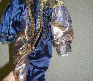 Coupon tissu 100 % coton bleu imprimé de motifs dorés, actuellement ourlé sur 2 côtés en nappe rectangulaire, Longueur : 292 cm, Largeur : 146 cm + second coupon ourlé , Longueur 1