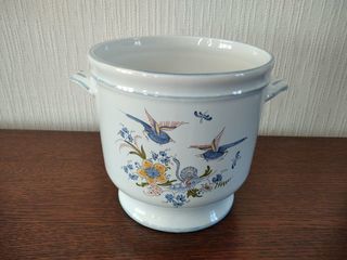 Cache-pot en céramique réputée de la Chapelle des Pots en Charente-Maritime. Fabrication artisanale, peint à la main, fond couleur blanche et décor de fleurs et oiseaux. Diamètre :