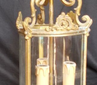 Lanterne à 3 points lumineux Ossature en laiton/bronze joliment décorée Vitres en verre Très bon état, en ordre de marche Dimensions (H x p x l) : 35 x 18 x 18 cm - hors chaî