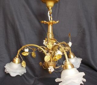 Très élégant lustre 3 branches terminées par des tulipes ouvragées en verre dépoli Bronze doré, laiton Décoration de feuillage en laiton ouvragé et petites fleurs en céramique ve