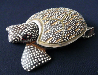 TORTUE DECORATIVE en Bois avec carapace amovible - Thaïlande, en Très Bon Etat Jolie tortue peinte et décorée constellée de points décoratifs blancs en Bois léger ramenée de