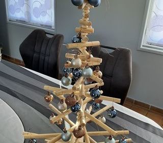 Pliable neuf,dans son carton :magnifique sapin de Noël bois ,muni de 42 boules assorties rangées elles également dans un carton