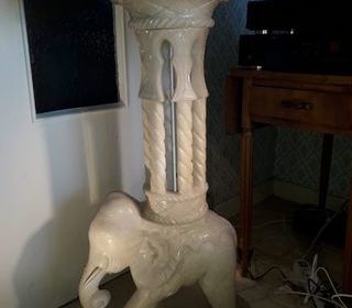 Signée Alduria. Hauteur 98 cm, diamètre console 53, largeur bas 53 cm. Hauteur Eléphant 41 cm. Magnifiques reflets avec lumière au pied. A retirer à Oullins
