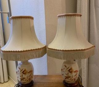 Pour un salon où les tables de nuit d'une chambre... Hauteur avec abat jour 52 cm, hauteur pied seul avec douille 31 cm. Base bois, pied céramique et abat jour tissu. A retire