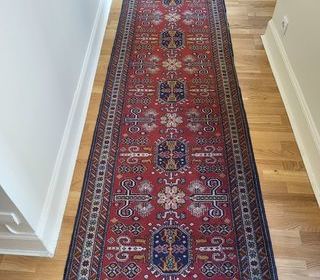 Tapis de couloir d'Orient, grandes richesses des motifs géométriques, couleur dominante: le rouge, pays d'origine (la Turquie, âge + de 30 ans. Dimensions: 356 X 80 Prix négocia