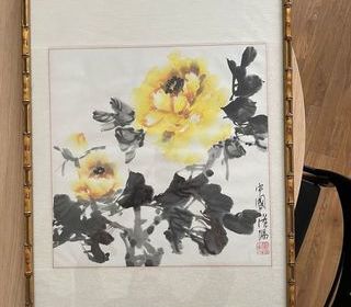 Fleurs de lotus Aquarelle sur papier signée en bas à droite Dimensions à vue : 34 x 33 cm Dimensions avec le cadre : 56 x 41 cm Le cadre est doré et texturé, évoquant une finit