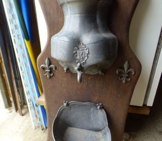 Ancienne Fontaine en Etain avec bac receveur - Ecusson motif Lion. Fleur de Lys - le socle est en bois, protégé à l'arrière par un tissu. Chaîne pour l'accrochage Antique Français