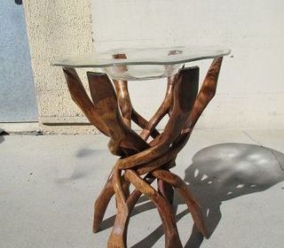 Exceptionnel piètement forme " Tamtam " sculpté dans un seul morceau de bois , tronc , certainement asiatique en Sheesham ( d'où les différences de coloris du bois) , vasque en p