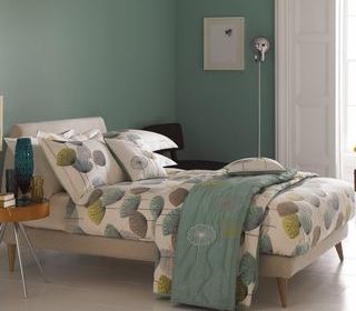 Superbe Couvre-lit/Couette Ouaté (Quilté) de la marque SANDERSON - Dimension 270X260cm pour lit double. Très Bon Etat - Couleur fond Ivoire, bordure couleur Céladon, motifs jaun