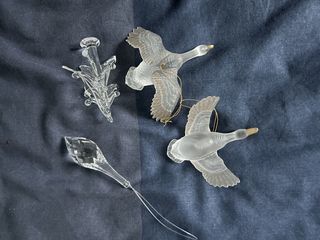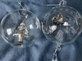 Je vends ce lot de boules de Noël en verre transparent, ornées de motifs élégants. 3 boules Motifs floraux et feuillages gravés et 1 avec un sapin argenté dedans Etat neuf Prix po