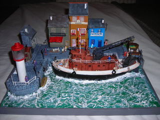 Diorama port de pêche avant la tempête. DIY Avec 1 éclairage clignotant pour le phare (pile 9 volts fournie) et un éclairage des maisons (piles fournies) ainsi que 13 personnage