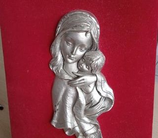 Cadre en velours rouge Représentant la vierge et l'enfant en relief en étain Peut être accroché ou posé Signé Geglio Md je pense Dimensions 22x30 cm