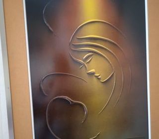 Tableau représentant la vierge et l'enfant en relief Avec un éclairage venant d'en haut Cadre en alu doré et pourtour en tissu Dimensions 47x62 cm Prix à débattre