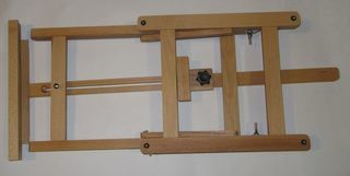 Chevalet en hêtre vernis Pour châssis jusqu'à 60 cm. Hauteur maximum de la toile : 60 cm. Largeur : 27,5 cm. Support toile : 29 cm. Poids : 1,4 kg. État