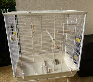 Grande cage pour oiseaux avec structure en métal et plastique, équipée de plusieurs perchoirs et accessoires à l'intérieur. La cage repose sur quatre pieds et possède une large por