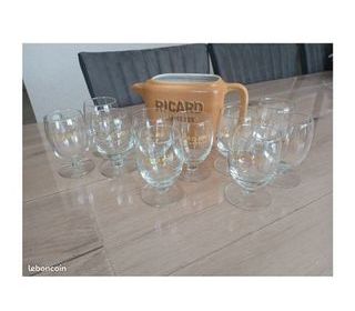 Service ricard véritable 1 pot a eau 1 litre en céramique ricard anisette + 10 verres ricard de bar dont 3 déco ricard anisette Diamètre 4cm hauteur 10cm Neuf