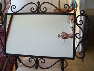 Miroir ancien, cadre fer forgé. A suspendre, attache par chaîne. Dim totale 84 x 56 cm. Dim miroir 34 x 58 cm.