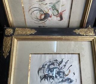 Lot de deux tableaux dans des cadres dorés à motif, comportant chacun une peinture abstraite sur fond de papier quadrillé. Les deux ?uvres présentent des couleurs variées et des fo