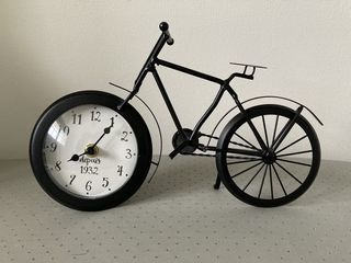 Pendule horloge originale - Forme Vélo - Coloris NOIR. Cette pendule en forme de vélo est à poser. Dimensions : Cadran diamètre 11 cm - Hauteur totale : 18 cm - Longueur 28,5 c