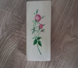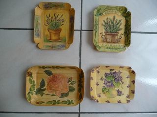 3 petits plateaux en bois décoré, travail artisanal, 4 motifs au choix : - Roses : 19.5 x 13.5 cm - Pot et bouquets de lavande : 16.5 x 13.5 cm - Romarin et fines herbes : 16