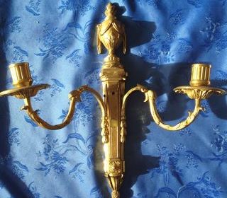 Applique murale bougeoir en laiton doré Hauteur 36 Largeur 34 2 bras supportent les coupelles et bobèches destinées aux chandelles