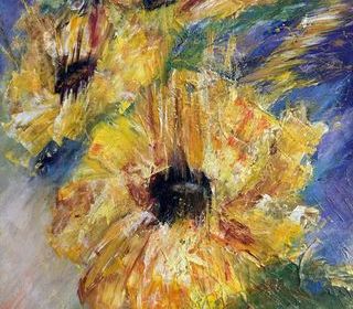 Tableau original intitulé " La danse des fleurs jaunes " réalisé avec des peintures acryliques sur toile. Å'uvre peinte avec une technique au couteau (impasto), créant une textur