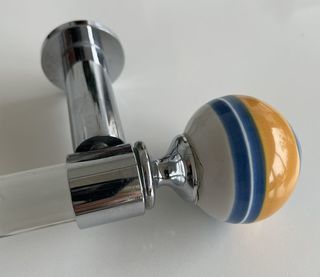 Une barre en verre avec 2 embouts en porcelaine. Une des extrémités à été recollée mais ça ne se voit quasiment pas. L'autre est en acier brosse Les fixations sont mobiles . Si