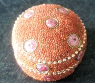 Petite boite marron en métal argenté recouvert de perles de couleur mordorée et de sequins roses en très bon état (quasiment neuve) Dimensions miroir : diamètre 8 cm x épaisseur 0
