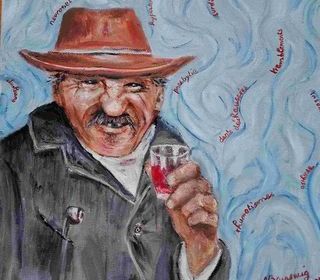 Un homme bon vivant et pas tout jeune tient un verre dans sa main gauche. Le tableau se veut cocasse et plein d'humour, puisque atteindre la vieillesse c'est sans doute merveilleux