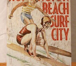 ELEMENT DECORATIF "SURF " PLAQUE METALLIQUE VINTAGE :"HUNTINGTON BEACH SURF CITY " Dimensions :41 cm x 32 cm . PARFAIT ETAT .
