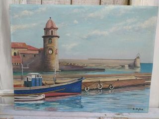 Tableau Marine Paysage Marin Phare de Collioure Signé Dufour Peinture à l'huile sur panneau d'Isorel format 66,5cm x 41cm Bon état. Vendu sans cadre.