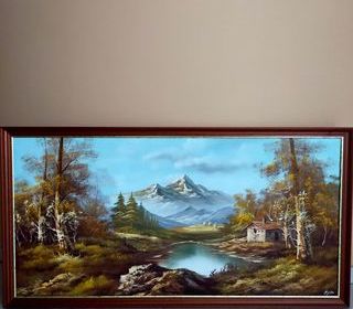 Vends tableau paysage en bon état. Dimensions avec le cadre : l 126cm H 66cm.