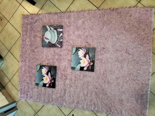 tapis rose/ lilas 1.20x1.60 avec de poils, réversible,donne pour aller à la machine de laver. avec 4 tableaux il manque une dans la photo. jolie pour metre dans une entre,une ch