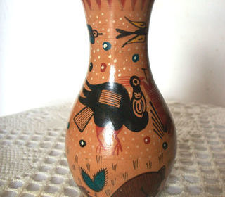 Vase rond vintage en céramique, poterie artisanale faite main. Motif oiseaux (condor) peints en noir sur fond beige et frise rouge et noir sur le col . Excellent état. Hauteur 10 c
