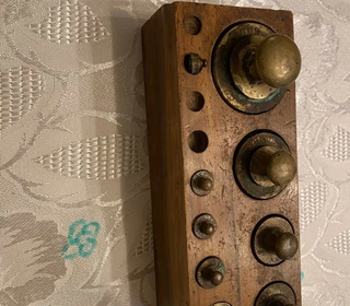 Ancienne Boite de poids en laiton. Vintage Antiquités. Il y a 9 poids et la boîte peut en contenir 12 Il en manque trois tout petits Les numéros 9, 10 et 12 25 €.