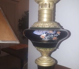 Pied de lampe Napoleon III, XIXe, électrifiée. Decor floral et paon sur fond noir,montée sur bronze. Réparation au pied à revoir.Hauteur 60cm, circonference 52cm.