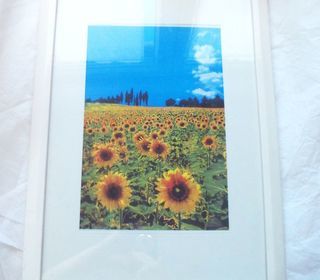 Tableau dimensions 49 cm de haut et 34 cm de large. Moulure bois laquée blanc Vitre et fond amovible. Photographie d'auteur (champ de tournesol de Toscane) Fait par un encadreu