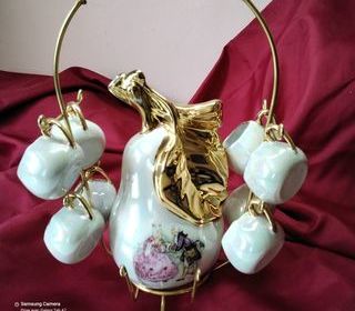 SERVICE A LIQUEUR POIRE AVEC HUIT VERRES PORCELAINE DE LIMOGES 20 CM DE HAUT TRÈS BON ÉTAT