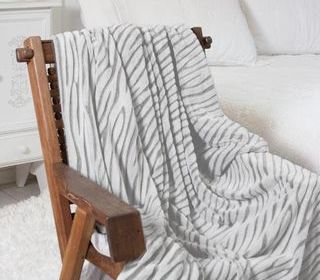Plaid en fausse fourrure, motif tigre, couleur blanc et taupe. Belle qualité, jolis reflets selon le sens du poil, ne peluche pas. Léger et ultra doux, confortable et très chaud,