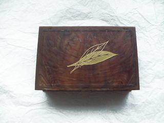Boîte à bijoux en bakélite marbré aux reflets translucides, miroir intérieur, motif doré sur le couvercle. Longueur : 16 cm Profondeur : 10,5 cm Hauteur : 4,8 mm Information