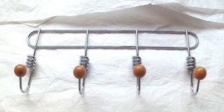 Patère à fixer, structure inox et pommeaux en chêne Fixation sur mur, porte, par rail ou supports de fixation Etat neuf (jamais posée, en double) Information : Vendeur sérieux