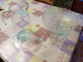 Une grande coupe à fruits en verre transparent, diamètre : 28 cm hauteur : 26 cm très bon état, prix :5 € pas d'envoi, pas de paiement en ligne Un grand pot à eau 2 litres, tr
