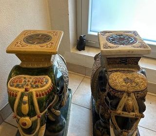 Deux éléphants décoratifs en céramique avec des motifs détaillés et colorés. Chaque éléphant est sculpté avec des ornements et possède un caparaçon riche en détails. Couleurs princ