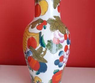 Grand vase blanc avec fruits dessus, filet doré encolure haut de 12cm, hauteur: 35cm. TBE. A prendre sur place.