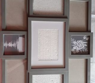 Cadre photos gris en plastique dur, hauteur totale: 42cm, largeur: 48cm. Pour 9 photos. TBE. A prendre sur place.