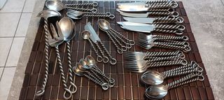 Couverts forgés et torsadés à la main, très raffinés, achetés 650$ il y a 30 ans à un petit artisan en Thaïlande. Acier inoxydable. Cette ménagère n'a jamais été utilisée (elle