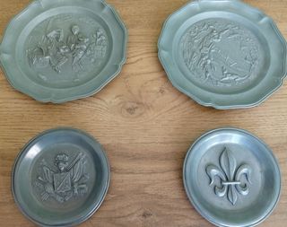 4 Assiettes en Etain 2 assiettes petites en Etain Poids 150 gr l'assiette et de diamètres 14 cm. Soit vendu séparément à votre convenance au prix de 15 € 2 assiettes grandes