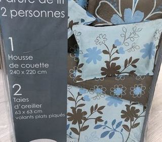 parure de lit FLEURS BLEU/ MARRON sur fond bleu pâle - housse de couette 220 x 240 cm - 2 TAIES D OREILLER 63 x 63 cm volants plats piqués coton 57 fils au cm 2 tres bonne l