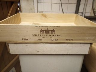 Diverses caisses en bois Pour bouteilles vin (VIDES) >Château ARSAC (2018) 6 bles a plat Margaux crus bourgeois exeptionel ....10€ >Château FEYTIT-LAGRAVE...2011